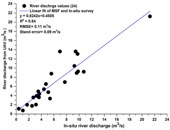Validation of the river discharge from the calculated results from the MSF over the study period are shown in Figure 6. The MSF gave different results for the river discharges in different locations and river discharges. The R2 value, standard error, and RMSE were 0.84, 0.09 m3/s, and 0.11 m3/s, respectively. The MSF function used in this study performed well and had determination coefficients greater than 0.80, and so gave better results when calculating the discharge of big rivers than for smaller rivers. The average NSE for the MSF for all the calculated river discharges was 0.79, which means that the formula selected in this method was appropriate for this ungauged area. The method used in this study can also supply satisfactory river discharge data compared to the data from the traditional hydrometric stations.