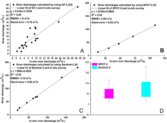 Comparison of the river discharges from the GF-2, SPOT-5, and Sentinel-2. (A): Performance of the GF-2 for calculating the river discharge; (B): Performance of the SPOT-5 for calculating the river discharge; (C): Performance of the Sentinel-2 for calculating the river discharge; (D): Comparison of the river discharges from the SPOT-5 and Sentinel-2.