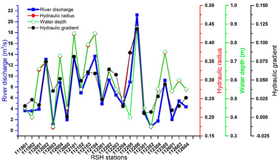 Sensitivity analysis was used to identify the parameters that influenced the results calculated by the MSF formula (Figure 9). This analysis showed that the water depth, roughness coefficient (), hydraulic gradient, and hydraulic radius were the most influential parameters. The water depth, hydraulic radius, and hydraulic gradient had a strong influence on the river discharge results. For the MSF used in this study, when the water depth, hydraulic radius, and hydraulic gradient were each increased by 10%, the resulting river discharges increased by 6.5% (water depth), 5.9% (hydraulic radius), and 4.1% (hydraulic gradient).