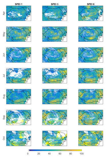 Simultaneous occurrence of NDVI anomalies lower than −0.025 and SPEI lower than −0.84, shown as a percentage of the number of months showing SPEI lower than −0.84, for the months of April to October and the time scales of 1, 3 and 6 months.