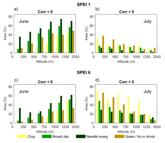 Correlations are strongly related to the elevation. Figure 4 shows the area (%) presenting significant correlation values for different land covers classes: cropland, broadleaved forest, needleleaved forest and grassland, considering several elevation intervals, and the time scales of 1 month [a) and b)] and 6 months [c) and d)]. Only the positive correlations obtained in June and the negative correlations obtained in July are shown and analyzed. Negative (positive) correlations were mainly observed at higher (lower) elevations, and a reduction of the size of the area was obtained with decreasing (increasing) elevation. The largest (smallest) area of negative (positive) correlations was observed for needleleaved forests at all the elevation intervals. Furthermore, a large area of positive correlations was observed for cropland. Moreover, with the exception of SPEI 6 for croplands, the grassland cover class accounted for the largest area of positive correlations at almost all intervals.