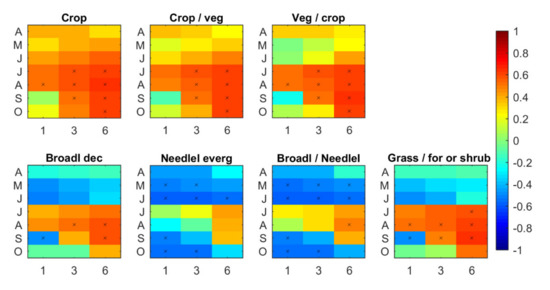 Figure 5 depicts, for each land cover class, the mean values of the significant correlations and corresponding standard deviations (only values lower than 0.2 are shown) obtained for each time scale and month. In agricultural areas, the mean correlation was mostly positive, but the standard deviation was low only from July onwards. For land cover consisting of forest, the area of significant correlations was smaller, but there was a clear pattern of negative correlations between April and June, and of positive correlations starting in July. Nonetheless, the mean correlation values for needleleaved forests were again negative (often significantly) in August and later when considered at short time scales.