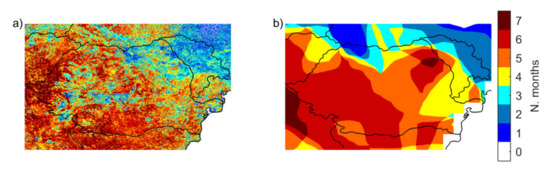 In this section we evaluated the impact of the 2000/2001 drought episode. Our assessment is based on an in-depth analysis of the NDVI anomalies from April to October 2000, which corresponds to the growing season during the drought event. The number of months displaying NDVIanom25 and SPEI84 are shown in Figure 6a,b, respectively. The northeastern region and part of the Carpathians were less affected by the drought, as evidenced by the persistence of low NDVI anomalies for 3 months or less (Figure 6a). In the remaining region, NDVIanom25 occurred for at least 4 months in roughly 70% of the area, and for at least 5 months in approximately 50% of the area. Moreover, drought conditions, as obtained by SPEI, are spread over most of the study area (Figure 6b). The main spatial pattern of reduction in the vegetation activity, as obtained through NDVI anomalies, was generally in accordance with the spatial pattern of SPEI, thus identifying that this drought event is linked with the decreased vegetation activity. According to SPEI, dry conditions persisted for a shorter time in the north and northeast, which explained the NDVI results. However, the spatial pattern for the Carpathian Mountains differed from the ones in the remaining areas.