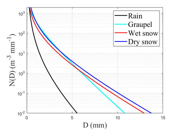 Mean hydrometeor size distributions (HSDs) of rain (black), graupel (cyan), wet snow (red), and dry snow (blue).