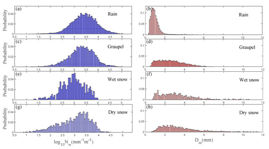 The probability histograms of the normalized intercept parameters log10Nw (mm−1m−3) (a,c,e,g) and mass-weighted mean diameters Dm (mm) (b,d,f,h) for rain, graupel, wet snow, and dry snow, respectively.