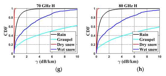 Cumulative distribution functions (CDFs) of horizontal-polarization attenuation rates induced by hydrometeors with frequencies of (a) 15 GHz, (b) 18 GHz, and (c) 25 GHz, (d) 38 GHz, (e) 50 GHz, (f) 60 GHz, (g) 70 GHz, and (h) 80 GHz for rain (black), graupel (cyan), wet snow (red), and dry snow (blue).