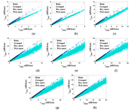 Scatter plots of horizontally and vertically polarized hydrometeor-induced attenuation pairs at frequencies of (a) 15 GHz, (b) 18 GHz, and (c) 25 GHz, (d) 38 GHz, (e) 50 GH, (f) 60 GHz, (g) 70 GHz, and (h) 80 GHz for rain (black square), graupel (cyan point), dry snow (red star), and wet snow (blue triangle).