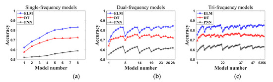 Test set accuracy of the ELM, DT, and PNN for (a) single-frequency, (b) dual-frequency, and (c) tri-frequency models, respectively.