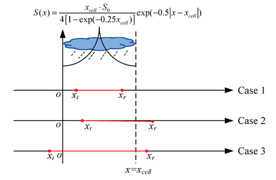for xcell = 10 km, S1 = 2.72 mm h−1. In addition, we used the HSD data obtained by disdrometer to fit the relationship between the Gamma parameters of different types of precipitation and the precipitation rate (see Table A2 in the Appendix A). Thus, according to an HSD sample, the HSD distribution of a precipitation cell can be obtained. Further, the locations of the link relative to the precipitation cell in three cases are shown in Figure 7. For Case 1 (0 < xt < xr < xcell, xt and xr represent the locations of the link transmitter and receiver, respectively), the link was completely within the coverage of the precipitation cell. For Case 2 (0 < xt < xcell < xr), one end of the link was outside the precipitation cell and the other was inside. For Case 3 (xt <0 < xcell < xr), both ends of the link were outside the precipitation cell. For each case, specific locations and lengths of different links were simulated and similar classification models ware established as above.