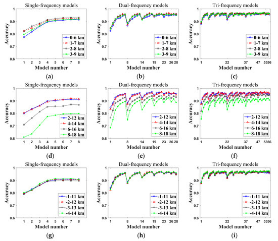 For Case 1, we assumed that the length of the link was 6 km, and the four location conditions relative to the precipitation cell were simulated ((xt, xr) was equal to (0, 6), (1, 7), (2, 8) and (3, 9), respectively, corresponding to getting closer and closer to the center of the precipitation cell) (as shown in Figure 8a–c. In general, due to the longer link length, the accuracies of the classification model were significantly improved (compared with those provided Section 4), no matter whether the model being used was a single-frequency, dual-frequency, or tri-frequency model (there are many combinations with accuracy greater than 95% in the dual-frequency and tri-frequency models). The increase of link length reduced the error, which corresponded to the analysis conclusion of Section 5.2. In addition, the trend of accuracy changing with the model number was basically unchanged (this was true not only for Case 1, but also for Cases 2 and 3, as shown in Figure 8d–i. Further, as the link came closer to the center of the precipitation cell (from 0–6 km to 1–7 km and then to 3–9 km), the accuracy of the model increased as a whole, but it decreased slightly as a whole when it was away from the precipitation cell (from 2–8 km to 3–9 km).
