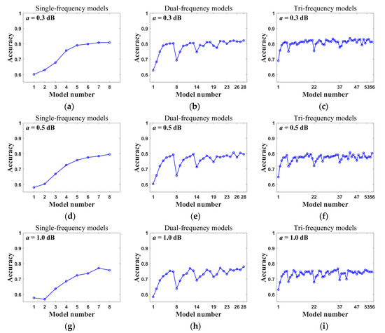 Test set accuracy of the ELM for single-frequency, dual-frequency, and tri-frequency models. (a–c) represent the single-frequency, dual-frequency, and triple-frequency models for a = 0.3 dB, respectively. (d–f) represent the single-frequency, dual-frequency, and triple-frequency models for a = 0.5 dB, respectively. (g–i) represent the single-frequency, dual-frequency, and triple-frequency models for a = 1.0 dB, respectively.