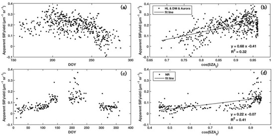 The seasonal change in apparent and its relationship with cos (SZA0) using the tower-based observations made at the HL, DM and Aurora maize sites (a,b) and the NR forest site (c,d). The apparent is the fluorescence quantum yield, DOY is the day of year, and cos (SZA0) is the cosine of the solar zenith angle at noon, used to represent the solar radiation intensity under clear-sky conditions. The black line is the fitted line.