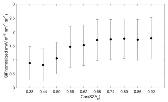 We used both satellite and tower-based data to obtain the relationship between and cos (SZA0). The SIF inversion was based mainly on the Fraunhofer Line Depth (FLD) and the Spectral Fitting Method (SFM). The tower-based cropland SIF dataset used in this study was acquired at the Huailai, Daman and Aurora sites [,,]. The canopy SIF data from Huailai and Daman covered the period from July to September in both 2017 and 2018, and from April to October in 2019. The canopy SIF dataset in maize field from Aurora site covered the period from July 2018 to September 2018 (doi: 10.22002/D1.1226), which are available from California Institute of Technology (https://data.caltech.edu/records/1226) []. Another canopy SIF dataset that was used was acquired at the Niwot Ridge site from June 2017 to June 2018; the major species here is evergreen needleleaf. This needle-scale SIF data (doi: 10.22002/D1.1231) are available from the California Institute of Technology (https://data.caltech.edu/records/1231) [].
