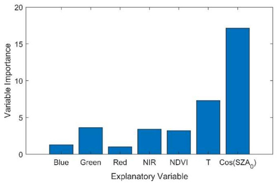 Figure 5 shows that cos (SZA0) and the air temperature proved to be the most important input parameters for ; the green and NIR reflectance and NDVI were the next most important. Healthy plants have a high reflectivity in the NIR band. The results for the performance of RF with six explanatory variables are shown as Figure 6.