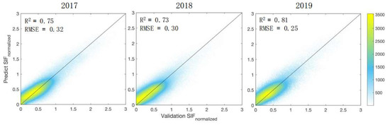 Performance of RF for TanSat SIF normalized by cos (SZA) using band reflectances, air temperature and cos (SZA0) and validation data sets from 2017–2019. The three columns show the validation results for each year. The different colors represent the sample density. The diagonal black line depicts the 1:1 relationship. The units of RMSE are mW m−2 nm−1 sr−1.