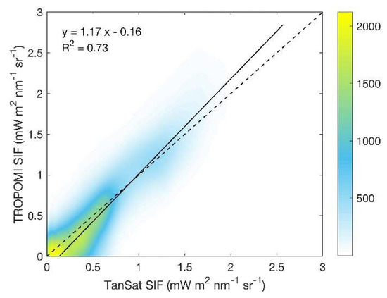 Since the transit time of TanSat and TROPOMI was almost the same at about 13:00 local time, the continuous TanSat SIF data were also validated using TROPOMI SIF data. In order to reduce the impact of noise, 0.05-degree TanSat SIF was aggregated to 0.2-degrees so that it could be compared with 0.2-degree TROPOMI SIF, as produced by Koehler et al. []. The comparison is illustrated in Figure 8. Since TROPOMI SIF is retrieved at around 740 nm, it has a higher value than TanSat SIF, which is retrieved at 758 nm. R2 was used to evaluate the consistency between the two data sets. The results show that the continuous TanSat SIF dataset agreed well with the TROPOMI SIF with an R2 of 0.73, indicating that the SIF can be well modeled by integrating cos (SZA0) with other metrics.