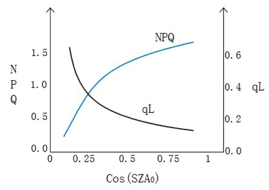 The biggest problem in existing SIF prediction models is that the influence of is not well considered. is mainly determined by heat dissipation () and the fraction of PSII reaction centers () []. increases as PAR increases, while decreases with increased PAR [,,]. Therefore, the solar radiation intensity should be taken into account for better SIF modelling. The relationship between cos (SZA) and PAR is approximately linear for clear-sky conditions. Based on the above relationship, we have drawn a conceptual diagram that briefly indicates the relationship between cos (SZA0) and /, as Figure 9. For satellite observations, only retrievals at clear-sky conditions were available; therefore, in this study, the cosine of the solar zenith angle at noon (cos (SZA0)) was used to represent the seasonal variation of solar radiation intensity.