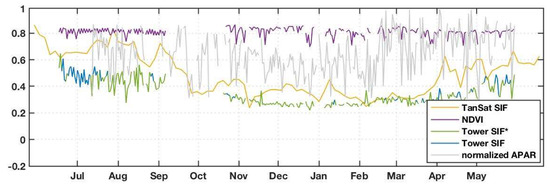 Seasonal dynamics of SIF, NDVI and APAR at the Niwot Ridge evergreen needleleaf forest site (40.03°N, 105.55°W, 26 m height, 3050 m elevation). The blue line (Tower SIF) shows tower-based effective daily mean (far-red) SIF under clear-sky, as shared by Magney et al. []. The green line (Tower SIF*) shows the other daily mean SIF. The yellow line shows the continuous (758 nm) TanSat SIF. The purple line shows the in-situ NDVI. The grey line shows the in-situ APAR. The units of SIF are mW m−2 μm−1 sr−1.