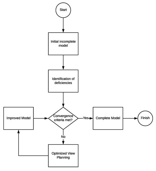 The authors present a novel approach for mapping different terrains, including industrial equipment, for which no a priori models or DEMs are available or existing DEMs present deficiencies. For the purposes of this study, deficiencies in the model are defined as areas where the model is incomplete (i.e., holes in the model). The algorithm uses UAVs and photogrammetry in an iterative fashion, the approach optimizes the next set of best views that will improve the model’s orthomosaic resolution. Figure 1 represents the general workflow of the iterative modeling algorithm.