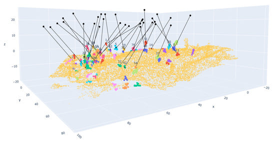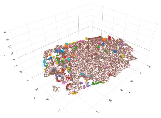 One approach to finding the optimal value of that must be used to identify the maximum number of deficiencies with DBSCAN, is by using gradient free algorithms such as genetic algorithms (GA). Figure 5 shows the clustering that results from using an optimal value of as calculated with a GA for a sample point cloud. In this figure, each cluster of deficiencies is identified with an arbitrary color besides brown.