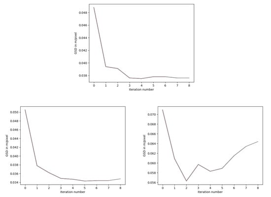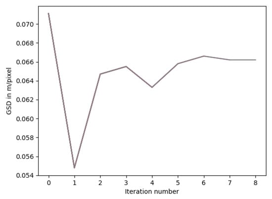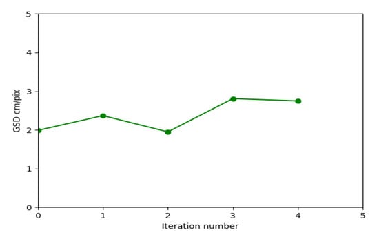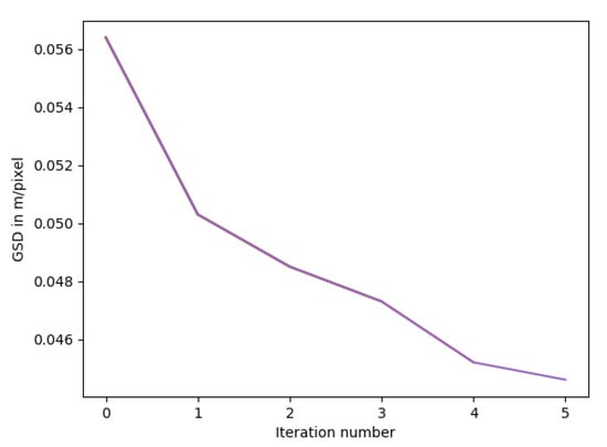The chosen convergence criterion for this algorithm is the orthomosaic resolution of the final model. Figure 7 shows a model converging to improvement from the initial orthomosaic resolution in 5 iterations.