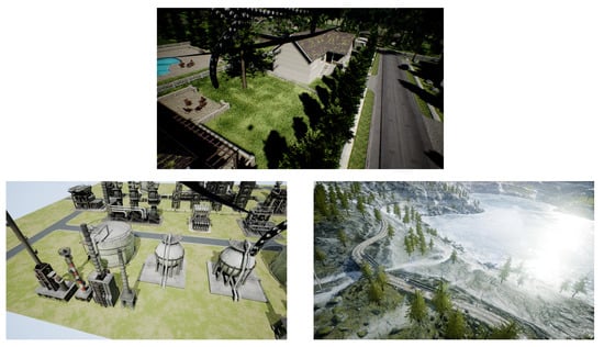 The performance of the proposed iterative modeling strategy was first evaluated using AirSim [48]. AirSim is an open source UAV simulator widely used by many researchers that develop similar applications and is available on GitHub (https://github.com/microsoft/AirSim) [49,50]. Three different types of environments were used for the simulations (See Figure 8).