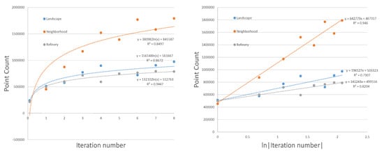 Figure 10 shows the amount of points in each dense cloud after every iteration as well as demonstrates a logarithmic curve fit (approximating zero as in the left graph and removing Iteration-0 from the right graph). The value for each regression varies from to for the landscape, neighborhood, and refinery, and indicates that a logarithmic curve fit naturally matches the simulated data for all three example environments. The increasing number of points is an indication of sufficient overlapping for accurate SfM and of the model increasing both in size and in density. Similarly to GSD, the number of points trend toward a steady value after several iterations, suggesting a limit to the model density that can be obtained with the specified restrictions on safety limits, and camera resolution. In an automated mission, this limiting behavior could serve as a second convergence criterion to prevent the UAV from flying a mission that will not contribute to model improvement.