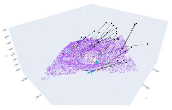 Fitting a plane to a number of points in the Euclidean space is a well understood mathematical problem. In this study, Principal Component Analysis (PCA) fits a plane that fits the points in each cluster [47]. PCA calculates the best fitting plane to a group of points in the Euclidean space by analyzing the variance in the data and projecting the points onto a plane spanned by the two dimensions where the variance is higher. Note that if no clustering is applied to the dense cloud, analysis with PCA renders a single plane that best fits all the boundary points. This singular plane and normal might provide the NBV if the number of photos is minimized. However, in many cases, the area being mapped via SfM is a complex set of faces and the optimal amount of photos should maximize coverage. In the proposed algorithm, DBSCAN approximates as many faces as possible by clustering points of similar density. Therefore, it is desired to maximize the number of clusters at each iteration. The eigenvectors from PCA performed on each cluster calculate the camera orientations or views. The normal vector extends to a safety height with the use of a scaling factor that is tuned manually after the first flight, and elevation and azimuth angles are calculated. Some of the normals calculated result in cameras underground or inside the model or would not reach the specified safety height. These normals are eliminated and no cameras are calculated at those locations. Figure 6 shows a view plan calculated using the methods described above.