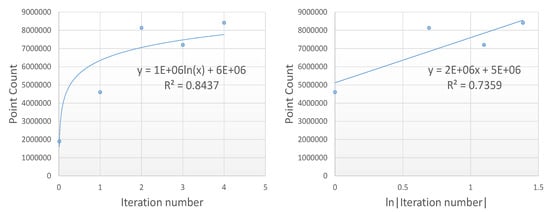 Points per iteration and logarithmic regression: Iteration number vs. Point Count (left) and ln|Iteration number| vs. Point Count (right).