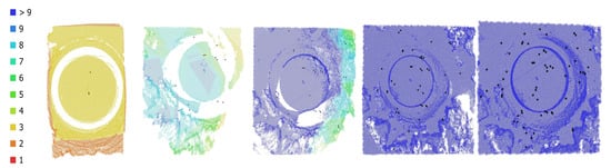 Figure 11 further confirms overlapping, as reported by Metashape after each iteration. In the first few iterations, the area of interest is completely covered by at least 9 photographs that overlap. In the remaining iterations, the photos gathered by the UAV attempt to increase the overall resolution. As mentioned in Section 2: Methods, distance between centroid and k-NN re-evaluates after each iteration and the 90th percentile of the distribution of distances is selected as the threshold value to classify a group of points as a deficiency. While collecting more photos inherently contributes to model density, the proposed algorithm seeks to gather photos at targeted areas of lower point cloud density.