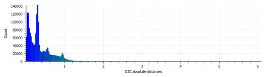 Figure 21 gives a distribution of absolute distances from CloudCompare for each point of the final iterative model as compared to the high density standard. Although the distances are on a scale internal to CloudCompare, the distribution of points’ average distance from the high density standard indicates that the two models match each other qualitatively because the majority of the points are within two distance units of the high density model.