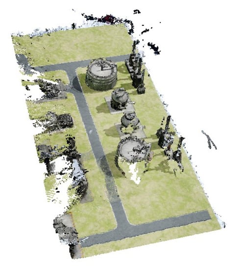 While failed point clusters in the model are not part of the region of interest, and the region of interest is visually progressing towards a more refined model, the average GSD adversely rises due to the new deficiencies. Therefore, it is proposed to use an alternative metric for convergence when the iterative algorithm is used in complex environments (e.g., petrochemical or manufacturing facilities). The proposed metric consists of trimming the point cloud to the region of interest, and evaluating the local resolution using Equation (1) as proposed proposed in Mineo et al. [38]: