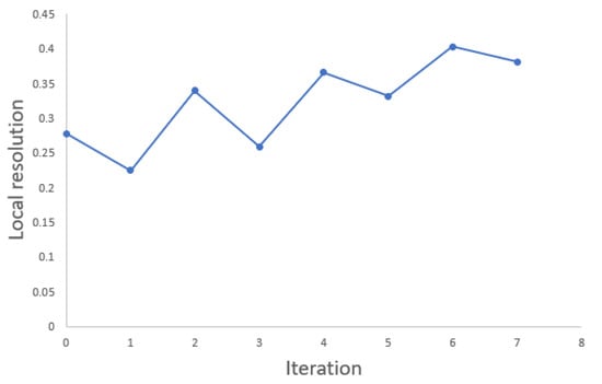 where is the local point cloud resolution, is the mean value of the minimum distances between a point and its nearest neighbors, and is the standard deviation. Figure 26 confirms that evaluation of a localized trimmed-down portion of a point cloud increases in resolution with each iteration. Figure 27 displays the evolution of the model’s GSD over 7 iterations. Using this metric, the iterative algorithm may be stopped after a desired level of local resolution has been achieved.
