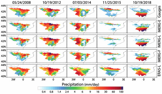 | SAIH-Ebro | In situ | 0.1° × 0.1° (daily) | Gridded data derived from rain gauges network (Ebro River Basin Authority) | Navarro et al. [47] |
