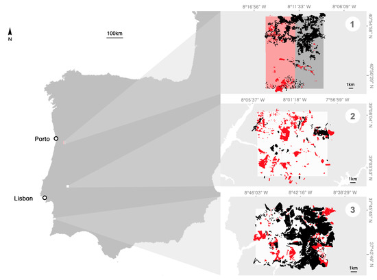 Regions that were selected for training (light red rectangle), validation (gray rectangle) and evaluation (white rectangles) of the model. Site number (1) is located in the Serras da Freita e Arada area, site number (2) in the Cabeção area and site number (3) in the Costa Sudoeste region. The ground truth map for Eucalyptus (black) and Conifers (red) is overlaid.
