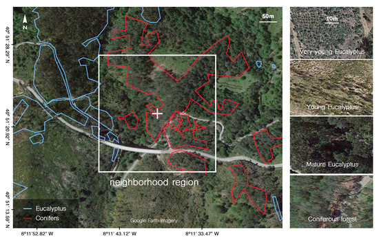 For Area (1) ground truth maps of Eucalyptus and coniferous forests (mostly Pinus pinaster and Pinus pinea) were created using high resolution imagery from Google Earth and were validated by walking and driving around in the study area. In a first step the satellite imagery was viewed systematically inside the study area and compared to known samples of satellite imagery of Eucalyptus as visualized in Figure 2. Throughout its life cycle from sapling to a mature tree the appearance on satellite imagery of Eucalyptus trees changes and these differences in appearance were taken into account. In a second step the areas where satellite imagery suggested the occurrence of Eucalyptus were marked using polygons in Google Earth Engine [32]. In a final step knowledge gathered from ground observations was used to correct the polygons.