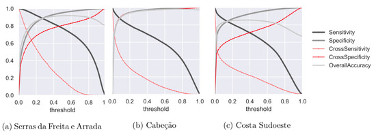 Model performance for the validation regions in three different study locations. The continuous output of the model was thresholded at 50 values between 0 and 1. For each threshold (abscissa) the sensitivity and specificity (ordinate) was calculated. Both cross-sensitivity and cross-specificity were calculated using ground truth maps for coniferous forests in the respective regions.