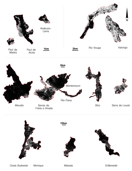 Initially, a ground truth map of existing plantations and locations of small incipient populations that are covered with Eucalyptus was created for three study sites for the year 2018 using a combination of in-situ observations that were carried out by driving the roads and walking around inside the study area as well as the visual interpretation of high resolution satellite imagery from Google Earth. The selected sites are located inside Natura 2000 areas in Portugal, one in the Serras da Freita e Arada region, Area (1), one in the Cabeção region, Area (2), as well as one further south in the Costa Sudoeste region, Area (3), as can be seen in Figure 1.