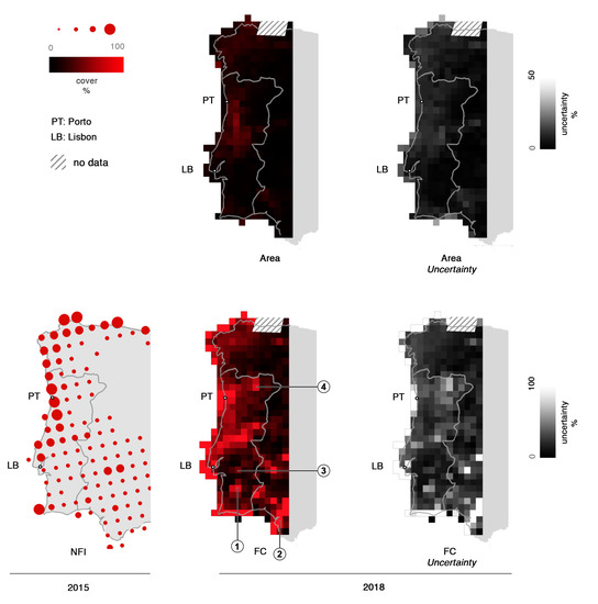 Distribution of areas covered with Eucalyptus in the western Iberian peninsula for the year 2018. The top map shows the percentage of the total area that is covered with Eucalyptus. The bottom map visualizes the percentage that is covered with Eucalyptus with respect to the maximum forest cover (FC) in the years between 2010 and 2018. Uncertainty of the estimates is shown in a separate map. For comparison a map based on data published by Cerasoli et al. [33] which relies on National Forest Inventory (NFI) data for the year 2015 is shown.
