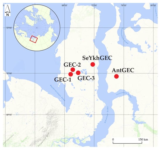 Gas emission craters (GECs) comprise a recently observed phenomenon in the permafrost zone. The first known GEC was discovered in the central part of the Yamal Peninsula in the summer of 2014. This discovery prompted studies of this feature and a search for similar craters. Information from local residents helped to discover other GECs. As of now, just a few features of this kind have been surveyed in the northern part of West Siberia (Figure 1). Although some researchers also depict other GECs [1,2], there are no published findings from comprehensive operations similar to those carried out on GECs shown in Figure 1. For that reason, other GECs will not be considered in this paper.