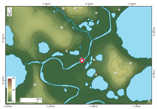 All known GECs are located in the northern part of West-Siberian Lowland. This region is characterized by continuous permafrost with rather low ground temperature (−4 to −7 °C on average) [12], thick layers of tabular ground ice in the geological section, and methane in the form of both gas and gas clathrates in the upper 120 m of the section [13,14,15]. The relief in the study area consists of several geomorphic units including a floodplain 0–5 m high, and a series of fluvial-lacustrine-marine plains and terraces within the height interval of 7–85 m, dissected by rivers, lakes, drained lake basins (khasyreys), and thermoerosion ravines and gullies. High-centered sand polygons and polygonal peat plateaus often occupy flat hilltops of the plains, otherwise represented by hummocky tundra landscapes. High willow shrub thickets mainly cover concave slopes while dwarf birch shrubs dominate convex slopes.