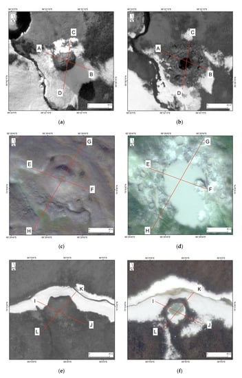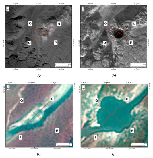 Satellite images before (left frame) and after (right frame) gas emission craters formation. GEC-1: (a) WorldView-1 image dated 09 June 2013 (pan) (mound in the center); (b) WorldView-1 image dated 15 June 2014 (pan) (crater with parapet in the center). GEC-2: (c) WorldView-2 image dated 11 September 2011 (synthesis of Red+Green+Blue) (mound in the center); (d) WorldView-2 image dated 21 July 2013 (synthesis of Red+Green+Blue) (inner lake in the center). GEC-3: (e) WorldView-1 image dated 09 June 2011 (pan) (mound in the center); (f) WorldView-2 image dated 10 June 2013 (synthesis of Red+Green+Blue) (inner lake in the center). AntGEC: (g) WorldView-2 image dated 21 August 2013 (pan) (mound in the center); (h) WorldView-1 image dated 11 October 2014 (pan) (crater in the center). SeYkhGEC: (i) SPOT7 image dated 19 July 2016 (synthesis of NIR+Red+Green) (mound in the center); (j) SPOT7 image dated 27 July 2017 (synthesis of NIR+Red+Green) (riverbed expansion in the center). Red lines indicate a position and letter designation of elevation profiles shown in Figure 5.