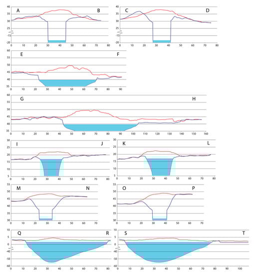 Elevation profiles across mound-predecessors and gas emission craters. Profile locations are shown in Figure 4. Profiles were plotted across GEC-1 (AB, CD), GEC-2 (EF, GH), GEC-3 (IJ, KL), and AntGEC (MN, OP) using the created DSMs, listed in Table 1. Profiles across SeYkhGEC (QR, ST) were plotted using 2-m spatial resolution ArcticDEM Stripes created based on images dated 19 April 2016 and 27 June 2017. The red line reflects the morphology of mound-predecessors, and the cyan line shows the morphology of GEC on dates closest to GEC formation as shown in Table 1. The light-blue shaded area presents a lake formed inside the GEC. Lake depth is obtained in the field. SeYkhGEC in the riverbed of the Myudriyakha river is shown to exceed 50 m in depth according to [7].