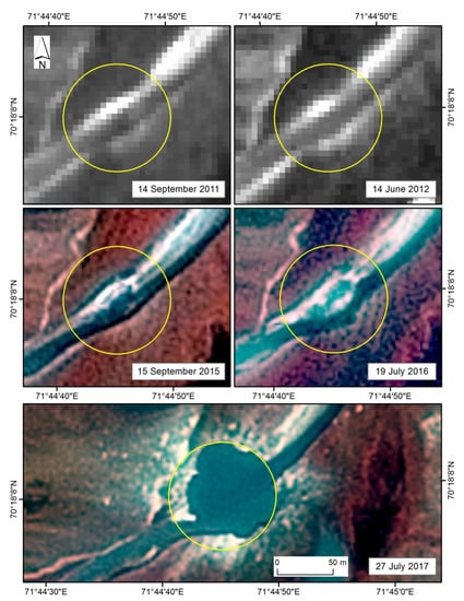 The GEC-1 formation timeframe was estimated to be between 9 October and 1 November 2013 (Table 2) based on the analysis of Landsat 8 imagery [16]. Our interpretation of imagery was guided by the following considerations. According to the measurements taken during the field survey on 16 July 2014 [31], as well as interpretation of WorldView-1 images dated 15 June 2014, the rim of GEC-1 was 25–29 m in diameter. As far as this GEC formed in the fall of 2013, since then its rim had retreated from its original size due to the thaw and collapse of its frozen icy walls. Based on a series of multi-temporal images, we suggest that a small (1.5 × 1.5 pixel) dark patch (with low reflectivity) is a GEC that can be interpreted with confidence in images starting 1 November 2013 [3,16]. Simultaneously, a light (high-reflectivity) patch appears on these images. Its spatial position coincides with the accumulative parapet clearly visible on later, very-high-resolution images from the summer of 2014. The expansion of the dark patch until 3 April 2014, can be explained by the fast melting of a thin layer of snow over the accumulative hillocks within the parapet that formed in the fall, 2013. These forms, clearly visible, were the first to expose from the snow.