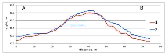 A comparison of elevation profiles plotted using the author’s DSM for GEC-1 (1), with ArcticDEM (2). Both lines are not smoothened. Figure 2a shows the spatial position of the profile AB across the GEC-1 mound-predecessor.