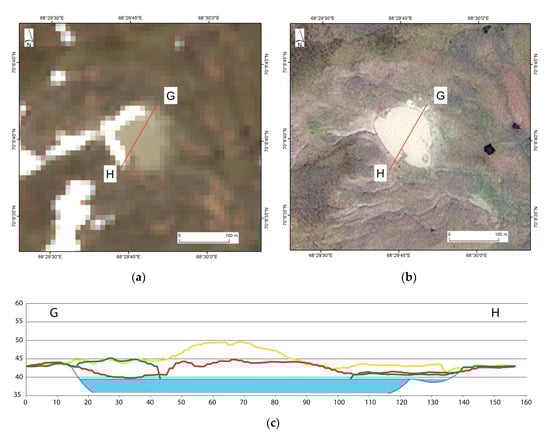 Validating the reliability of a “mound” observed in the GEC-2 location using ArcticDEM Stripe of 2016: (a) Surface conditions on 16 June 2016, based on Sentinel-2 image; (b) Surface conditions on 15 July 2016, based on SPOT6 image; (c) Elevation profiles: the red line is the surface plotted using ArcticDEM Stripe extracted from a 16 June 2016 imagery; the yellow line is the mound-predecessor surface “before” GEC formation extracted from multi-temporal stereo pair of 2010–2011 (Table 1); the green line is the surface “after” GEC formation on 21 July 2013 (Table 1); water surface boundaries are shown as of SPOT6 image dated 15 July 2016.