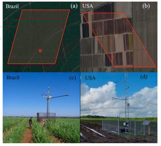 The longitude and latitude position information of the two sugarcane eddy covariance (EC) flux tower sites (red dot) and surrounding landscapes with one respective 500 m Moderate Resolution Imaging Spectroradiometer (MODIS) pixel (red polygon). (a,c), the USR site, Brazil; (b,d), the Louisiana site, USA.