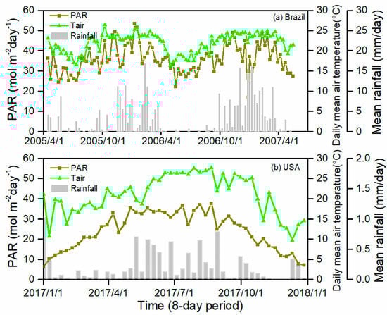 The seasonal variation in the daily mean air temperature (oC), rainfall, and photosynthetically active radiation (PAR) at the two sugarcane EC tower sites (8-day interval). (a) Brazil site, 2005–2007; (b) Louisiana site, USA, 2017.