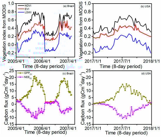 The seasonal variation in vegetation indices (Normalized Difference Vegetation Index (NDVI), Enhanced Vegetation Index (EVI), and Land Surface Water Index (LSWI)) derived from the MODIS images and the measured NEEEC and the estimated GPPEC at the two sugarcane EC tower sites (8-day interval). (a,c), Brazil site, 2005–2007; (b,d), Louisiana site, USA, 2017.