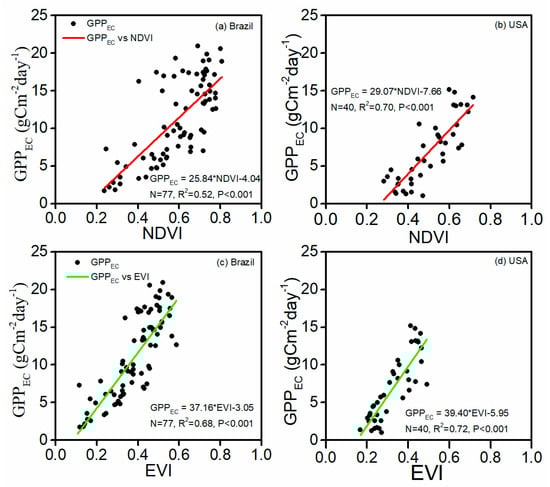 The connections between the estimated gross primary production(GPPEC)and two vegetation indices (NDVI, EVI) within the entire sugarcane growing season at the two sugarcane EC tower sites. (a,c), Brazil site, 2005–2007; (b,d), Louisiana, USA, 2017.